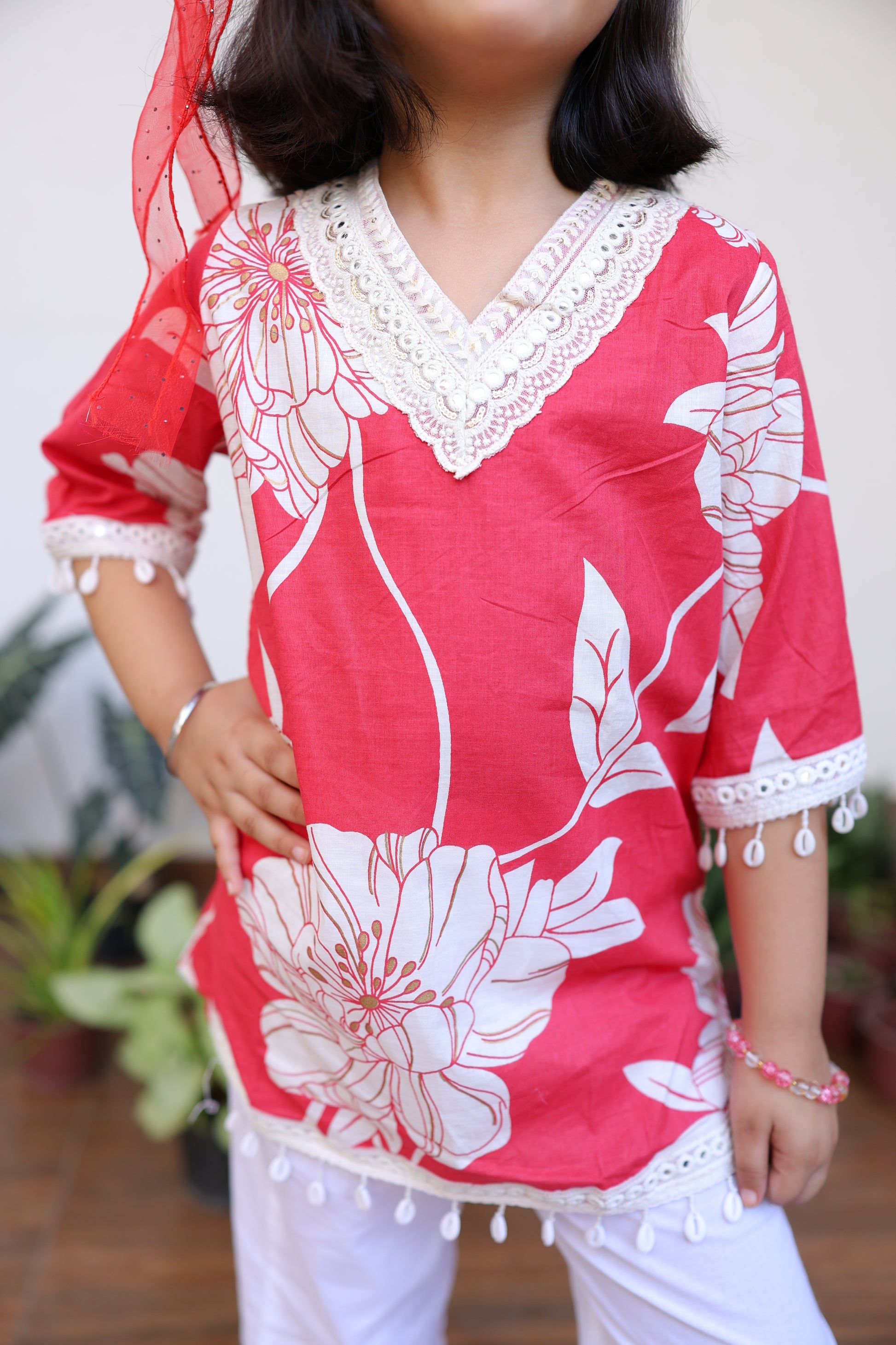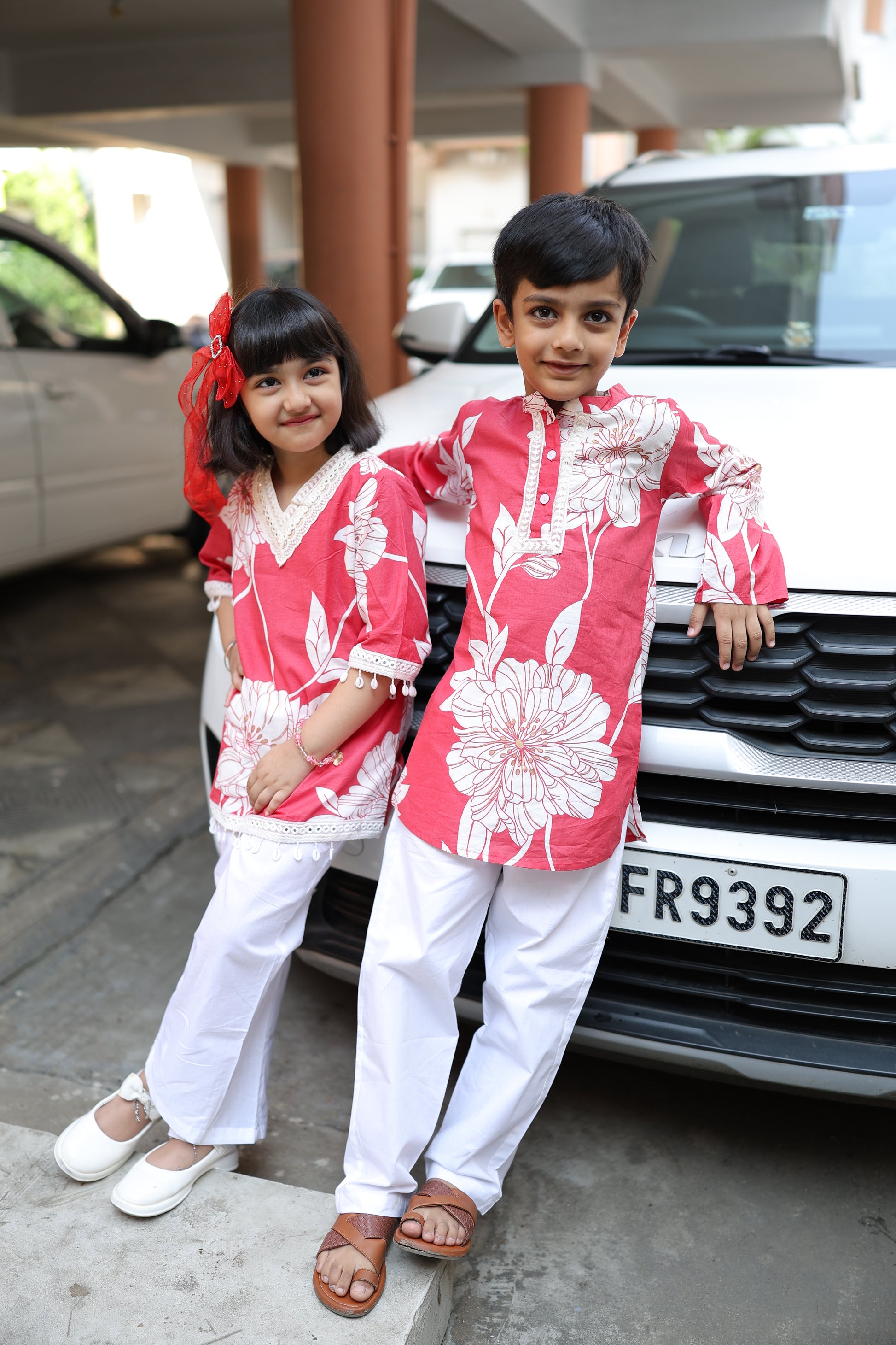 A perfect blend of comfort and charm β this pure cotton two-piece set is designed for your little fashionista to bloom in style. The soft floral print in coral pink and ivory adds a refreshing festive vibe while keeping her comfy all day long.