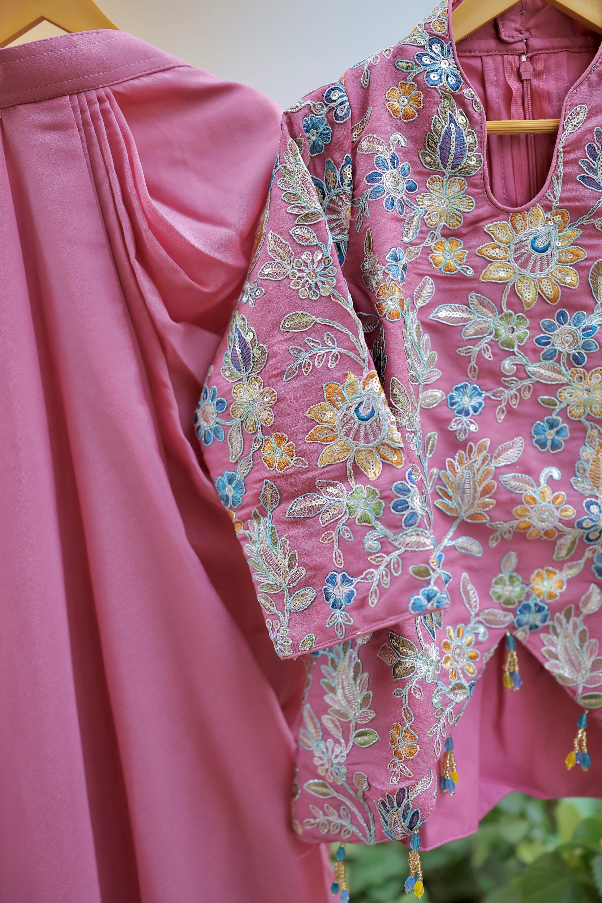 A graceful blend of tradition and comfort, the Fiza Floral Girls Tulip Skirt Set is designed for little celebrations and big twirls. Crafted in a soft blush tone, this outfit features intricate hand embroidery on the top and a beautifully draped tulip skirt that flows effortlessly with every move—making it perfect for festive occasions and special moments.