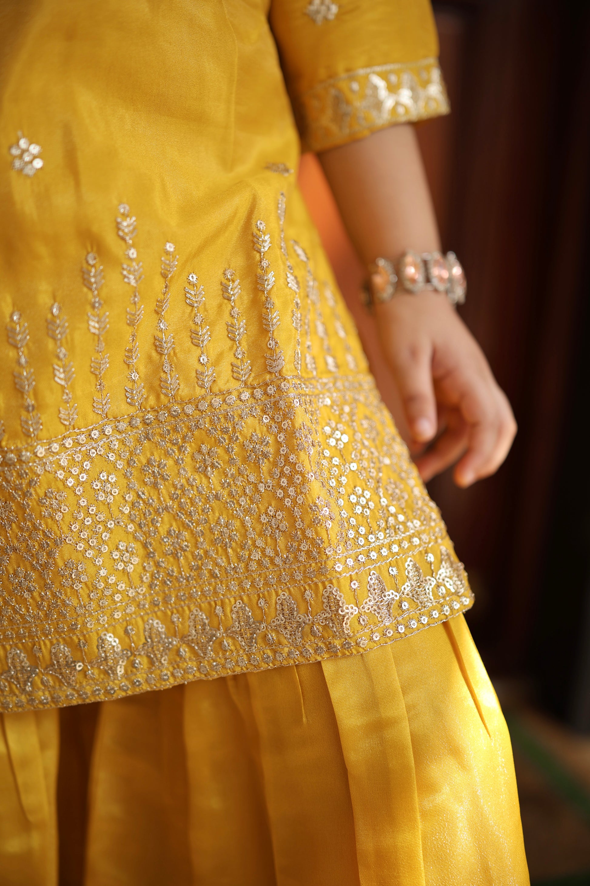 Bright, beautiful, and full of festive charm β this Set is a ray of sunshine your little one will adore! This elegant yellow three-piece set features a beautifully embroidered kurta paired with a flowy sharara and a pure chiffon dupatta. Perfect for weddings, festivities, or family celebrations, it blends comfort with traditional grace effortlessly.