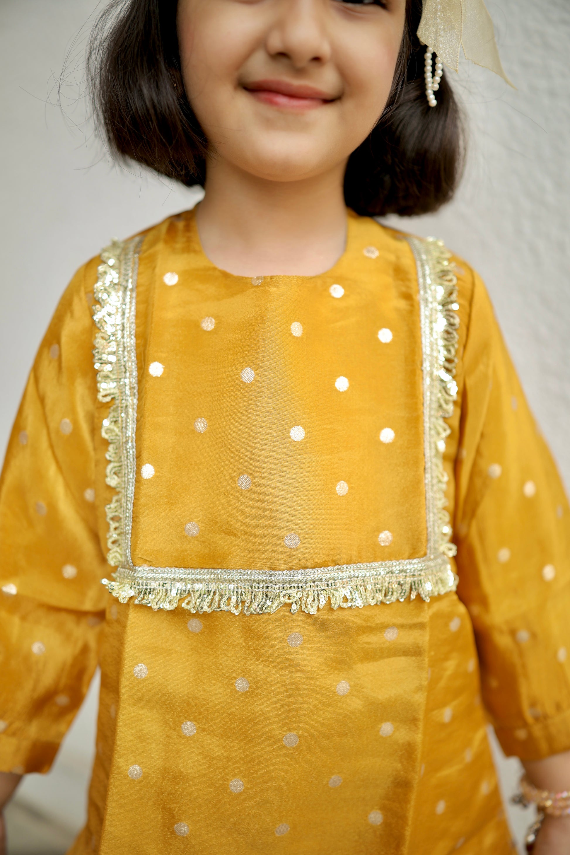 A sunshine-hued outfit that blends grace with comfort — the Golden Glow Kurta Set is designed for your little diva to shine bright this festive season! The tissue kurta features delicate polka dots and lace detailing, paired with soft chinnon pants for an easy, flowy fit.