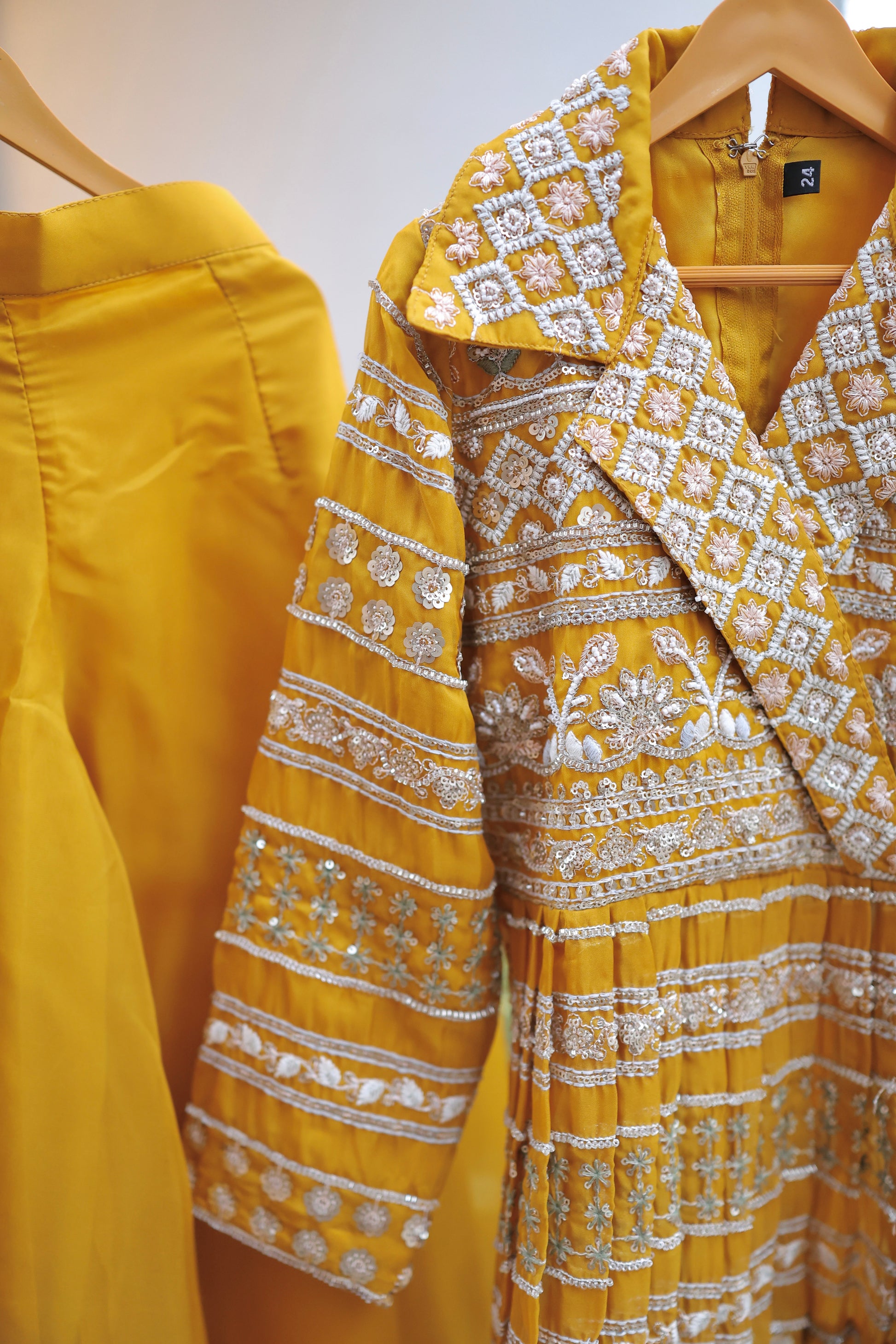 The set is crafted in soft georgette with intricate handwork beautifully spread across the full-sleeve top. The outfit comes with a comfortable attached lining and a lightweight net dupatta, making it a graceful yet easy-to-wear festive choice for little ones.